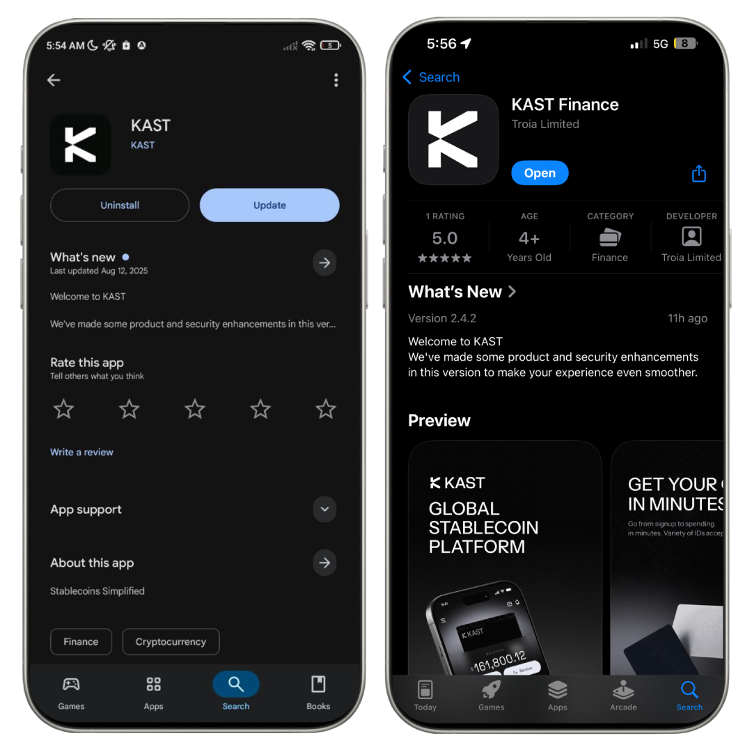 アプリ名は「KAST Finance」です。似たような名前のアプリがあるので、開発元が「KAST Finance」になっているものを選んでください。またこちらから登録すると、プレミアムカード等が特別価格で作成できるのでぜひご利用ください。